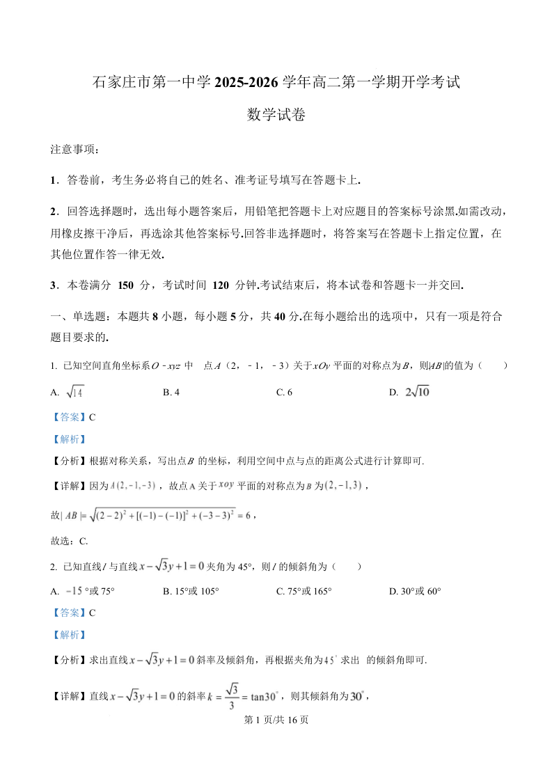 高二数学(精品解析版)--河北省石家庄市第一中学2025-2026学年高二上学期开学考试