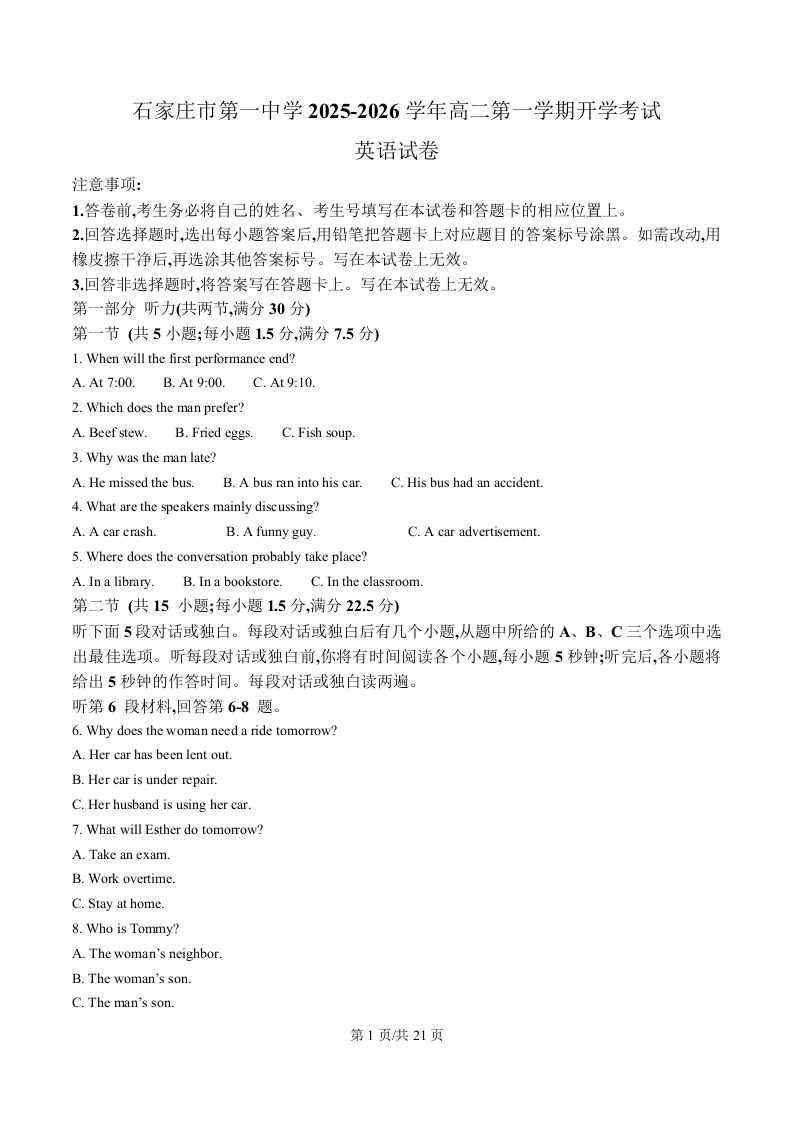 高二英语(精品解析版)--河北省石家庄市第一中学2025-2026学年高二上学期开学考试