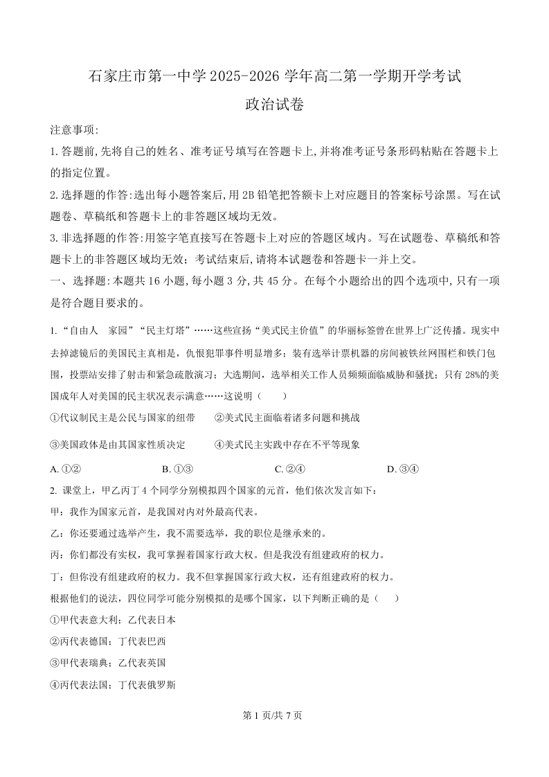 高二政治(原卷版)--河北省石家庄市第一中学2025-2026学年高二上学期开学考试