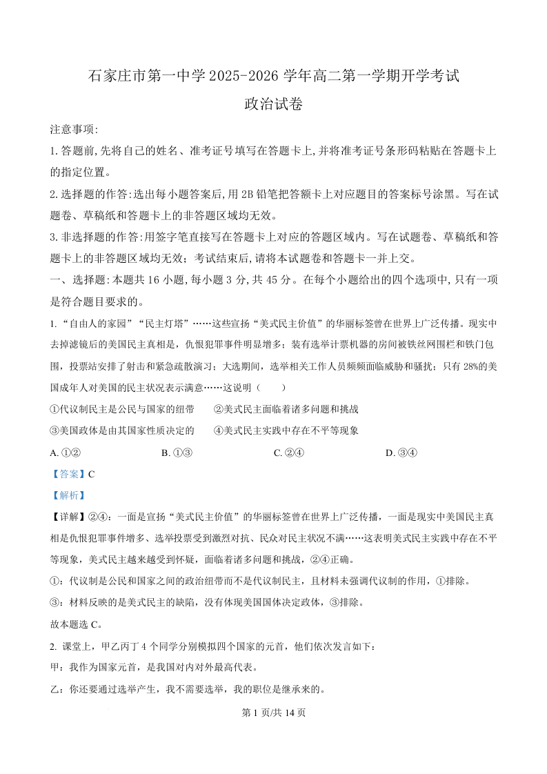 高二政治(精品解析版)--河北省石家庄市第一中学2025-2026学年高二上学期开学考试