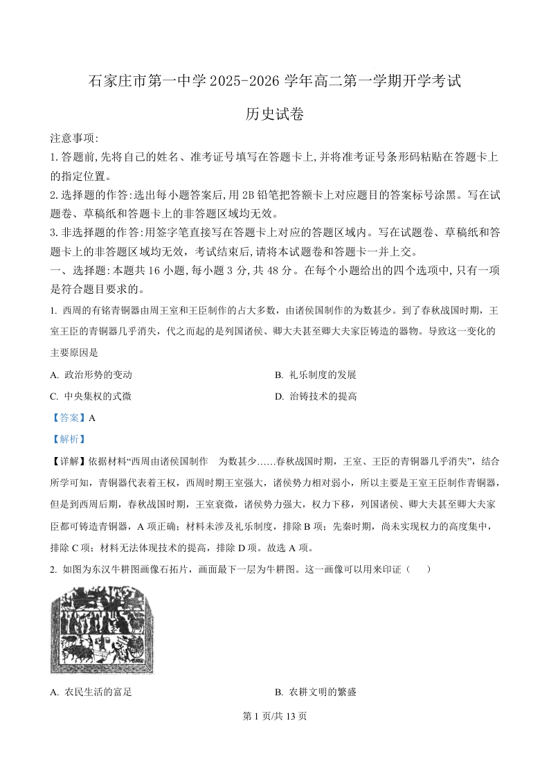 高二历史(精品解析版)--河北省石家庄市第一中学2025-2026学年高二上学期开学考试