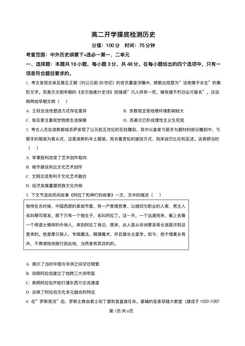 高二历史+答案--安徽省阜阳市临泉县第二中学2025-2026学年高二上学期开学考试