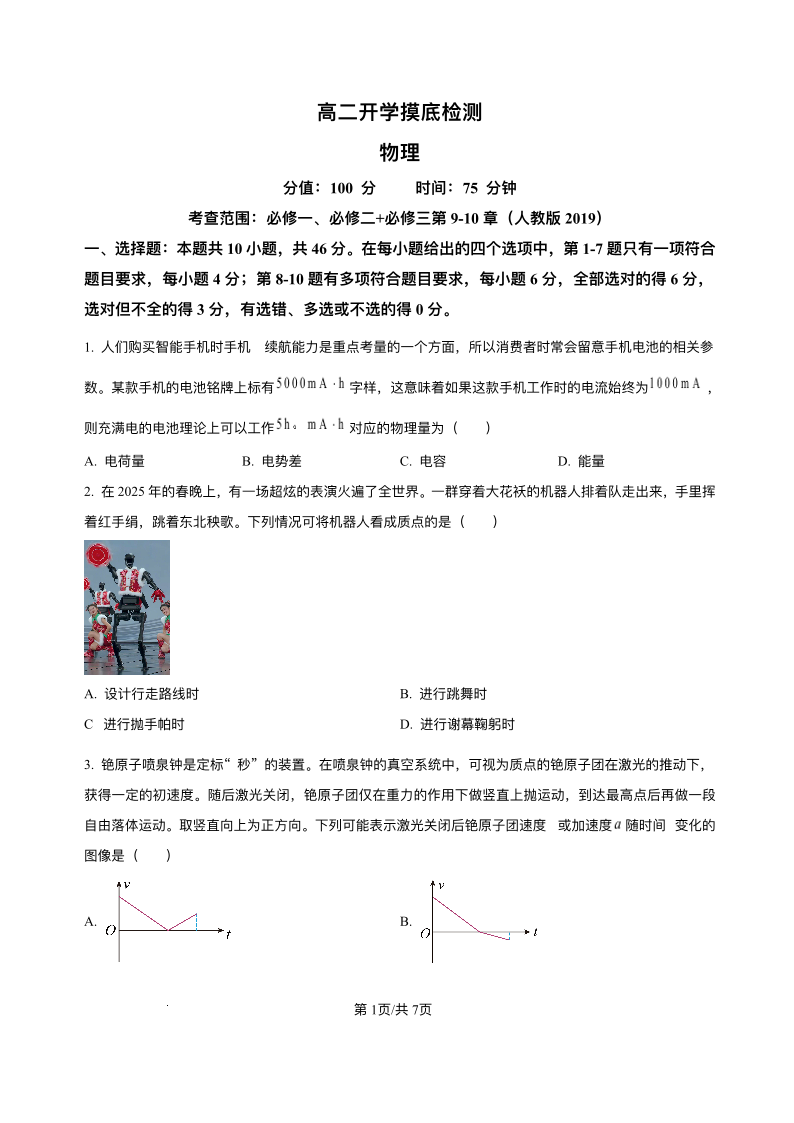 高二物理+答案--安徽省阜阳市临泉县田家炳实验中学(临泉县教师进修学校)2025-2026学年高二上学期开学考试