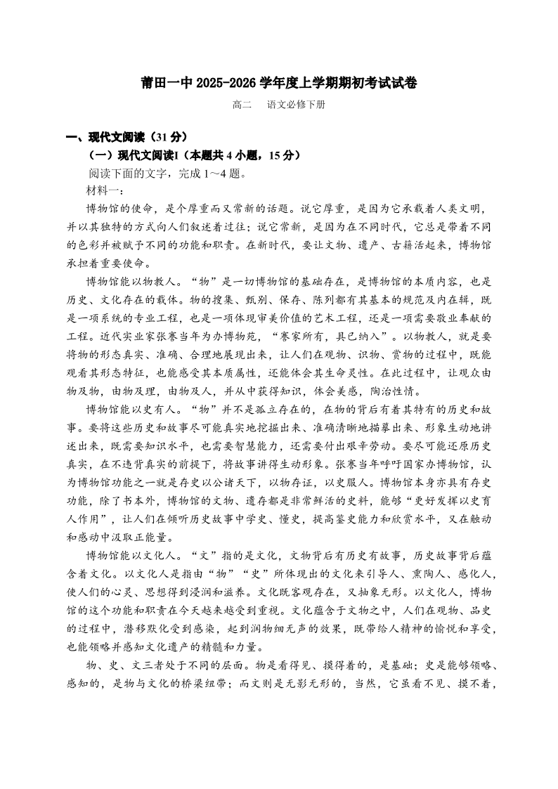 高二语文--福建省莆田第一中学2025-2026学年高二上学期开学考试