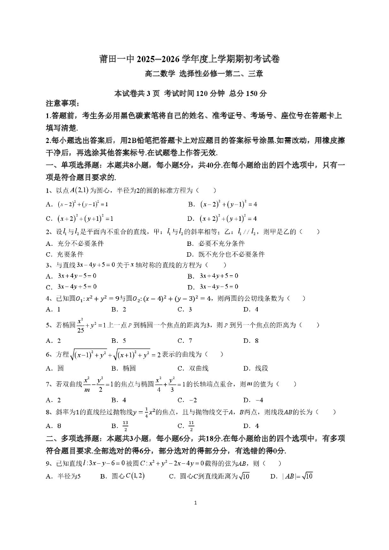 高二数学+答案--福建省莆田第一中学2025-2026学年高二上学期开学考试