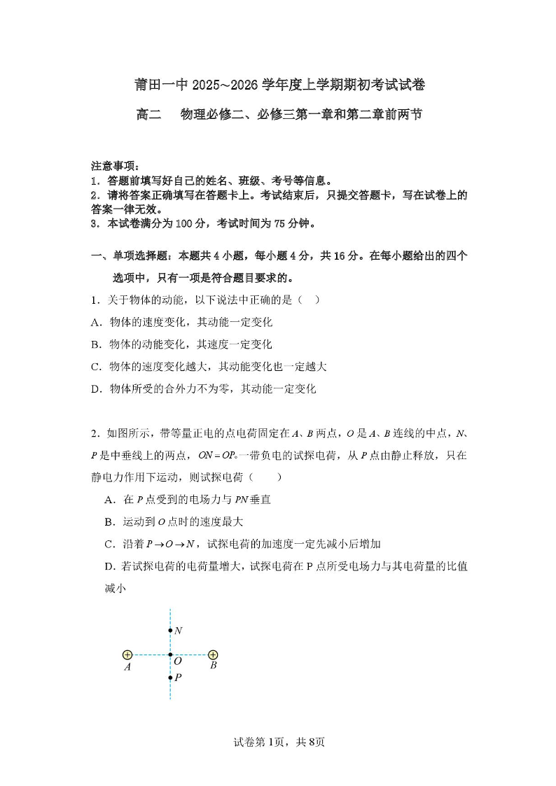 高二物理+答案--福建省莆田第一中学2025-2026学年高二上学期开学考试