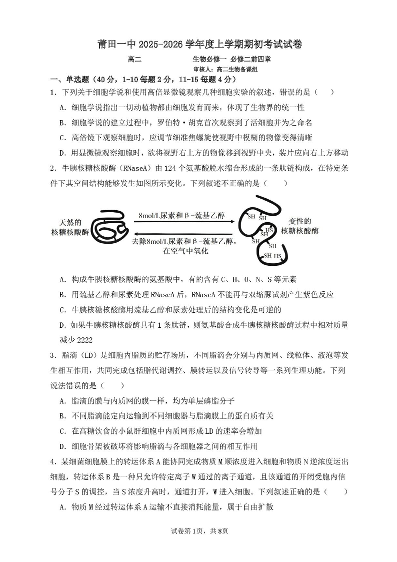 高二生物+答案--福建省莆田第一中学2025-2026学年高二上学期开学考试