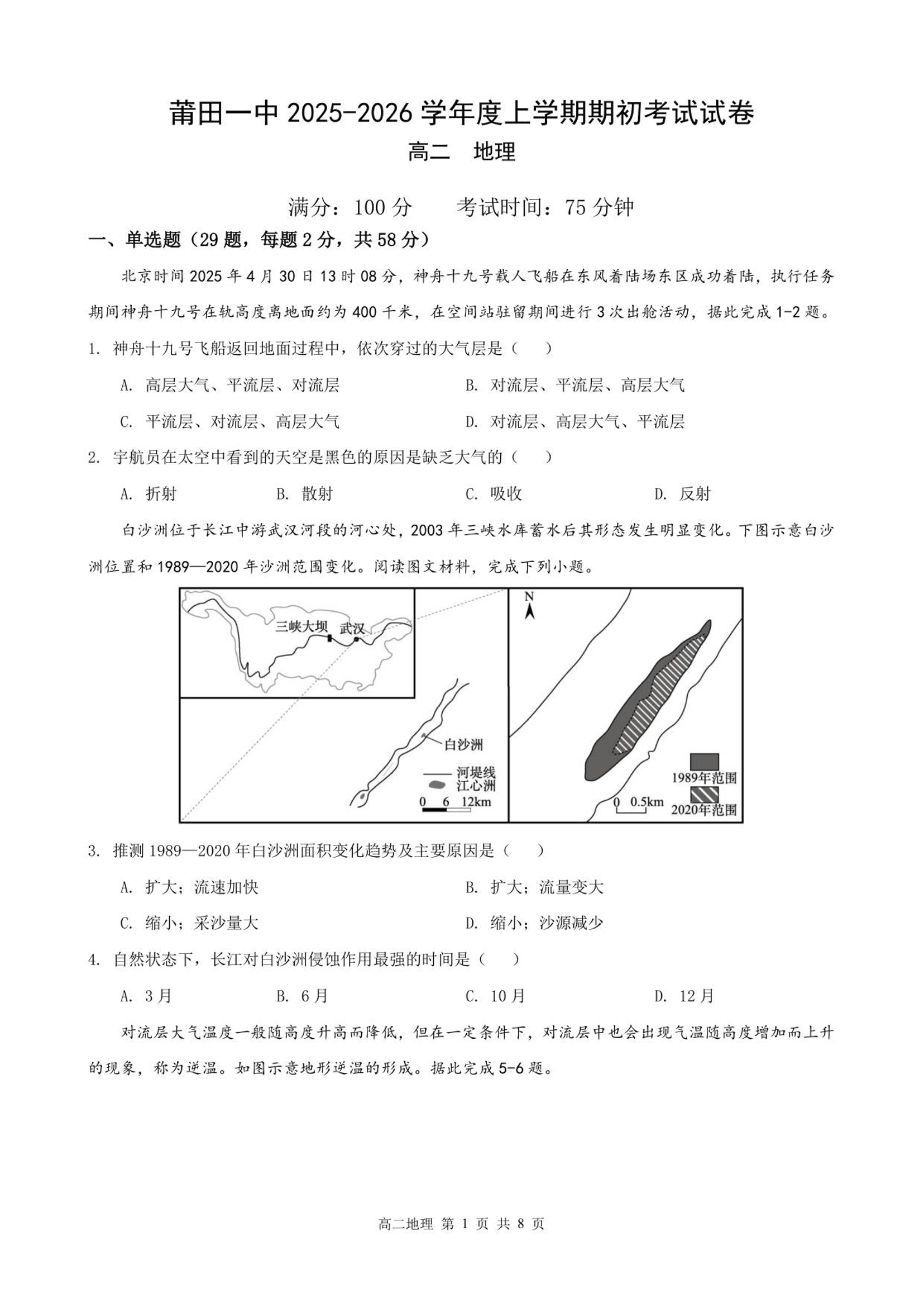 高二地理+答案--福建省莆田第一中学2025-2026学年高二上学期开学考试