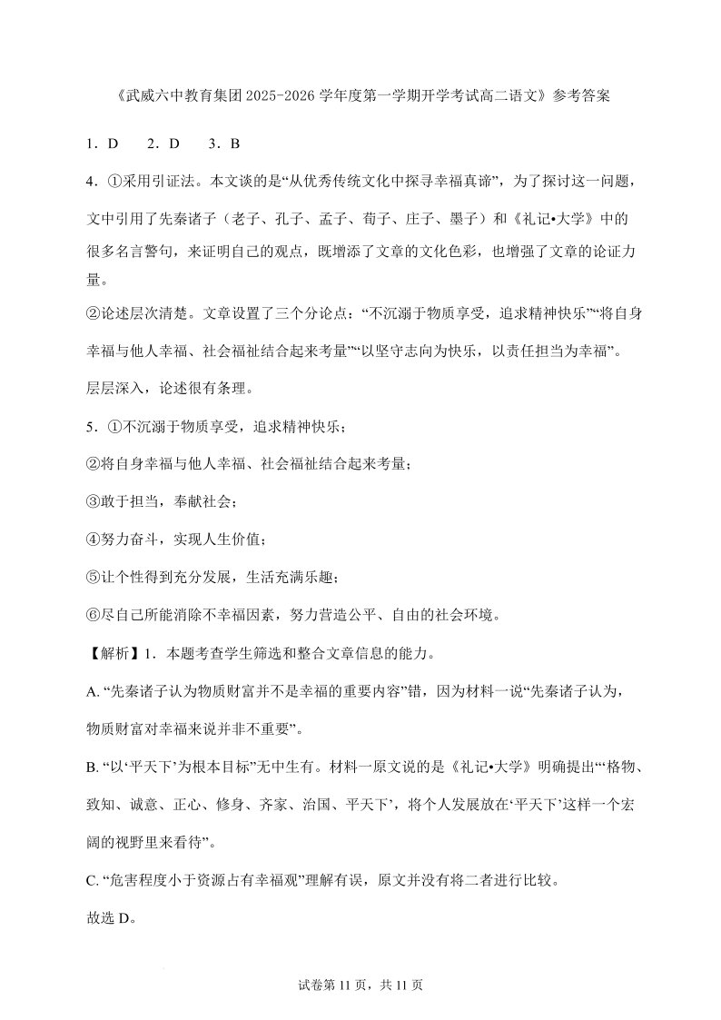 高二语文答案--甘肃省武威市第六中学2025-2026学年高二上学期开学考试