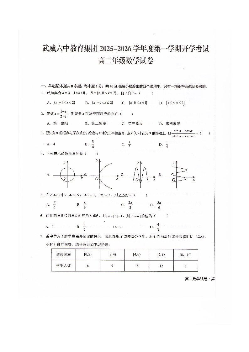 高二数学--甘肃省武威市第六中学2025-2026学年高二上学期开学考试