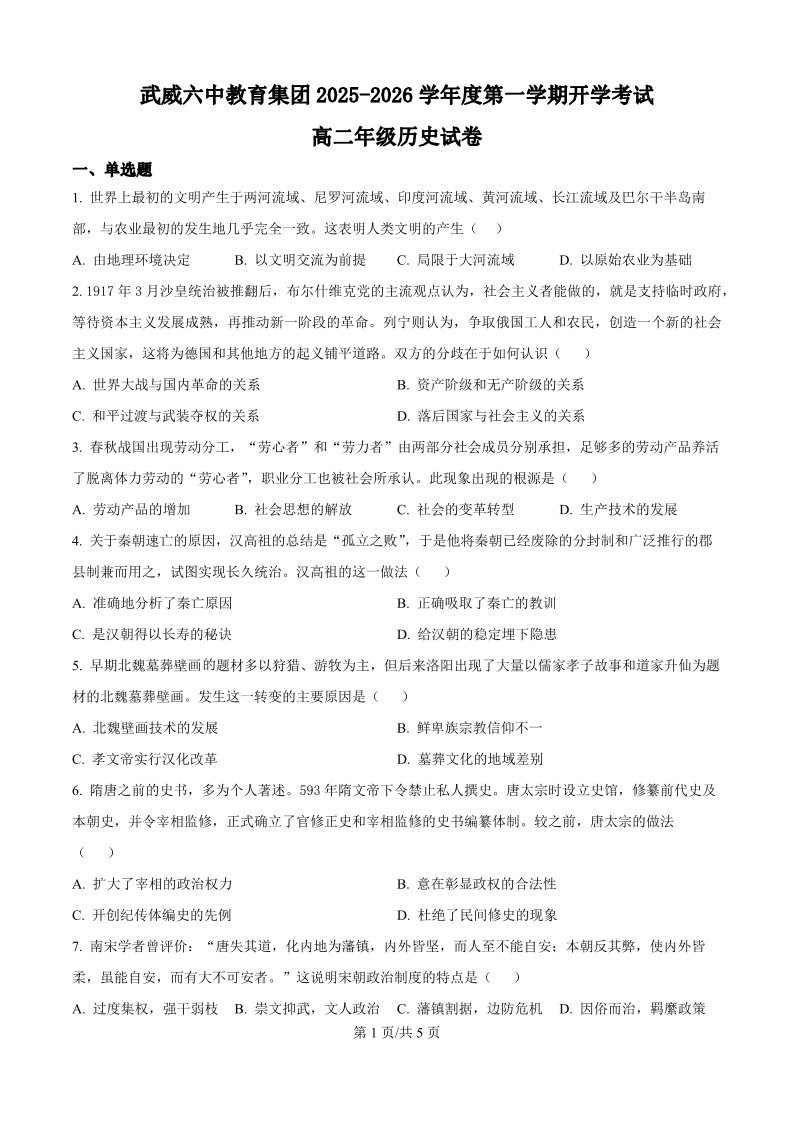 高二历史(原卷版)--甘肃省武威市第六中学2025-2026学年高二上学期开学考试