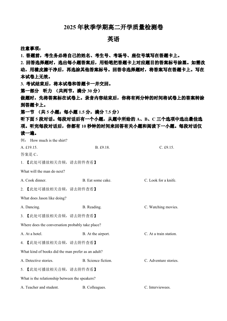 高二英语+答案--广西部分学校2025-2026学年高二上学期8月开学质量检测