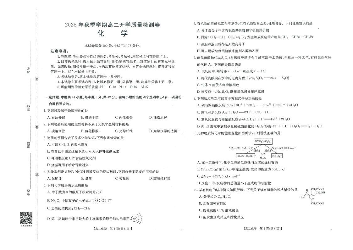 高二化学--广西部分学校2025-2026学年高二上学期8月开学质量检测