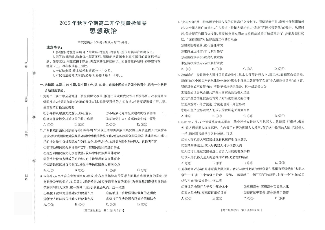 高二政治--广西部分学校2025-2026学年高二上学期8月开学质量检测