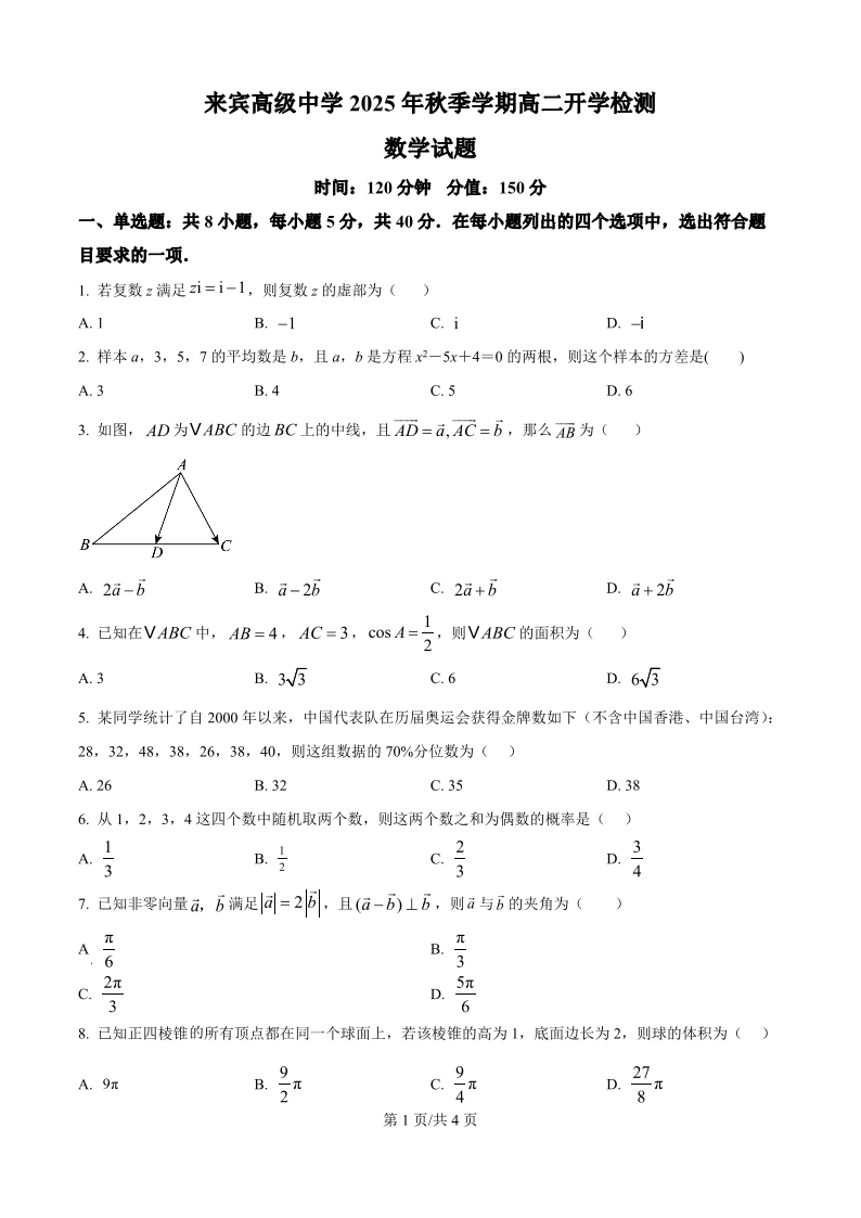 高二数学(原卷版)--广西壮族自治区来宾市兴宾区来宾高级中学2025-2026学年高二上学期开学考