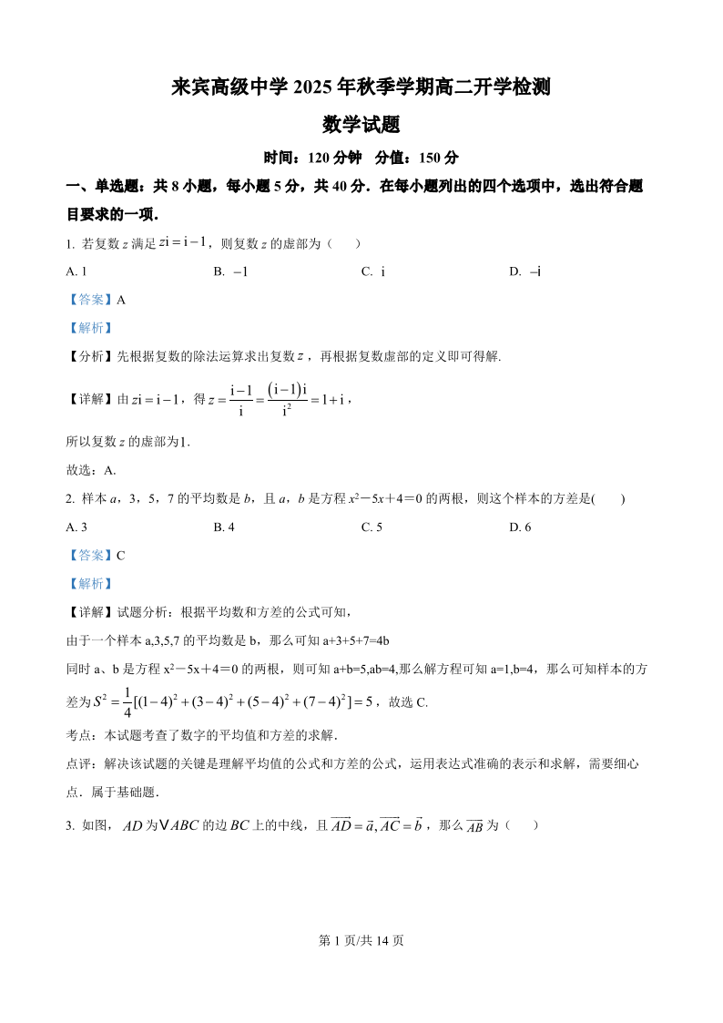 高二数学(精品解析版)--广西壮族自治区来宾市兴宾区来宾高级中学2025-2026学年高二上学期开学考
