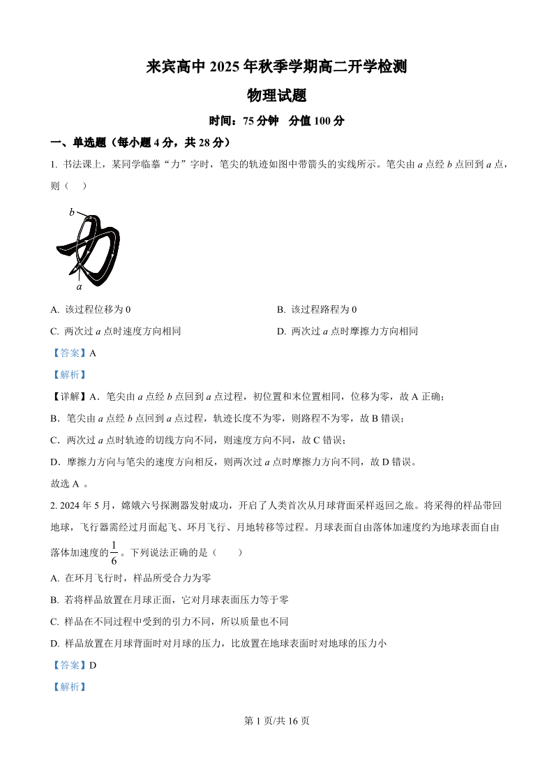 高二物理(精品解析版)--广西壮族自治区来宾市兴宾区来宾高级中学2025-2026学年高二上学期开学考