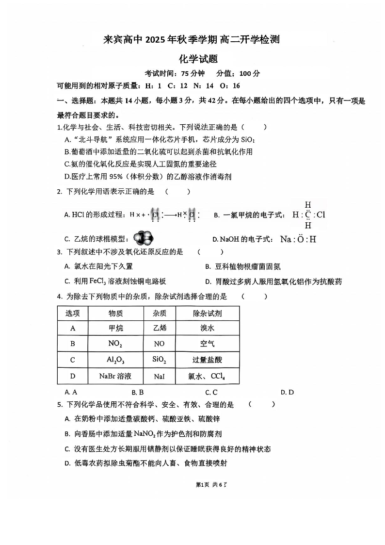 高二化学+答案--广西壮族自治区来宾市兴宾区来宾高级中学2025-2026学年高二上学期开学考