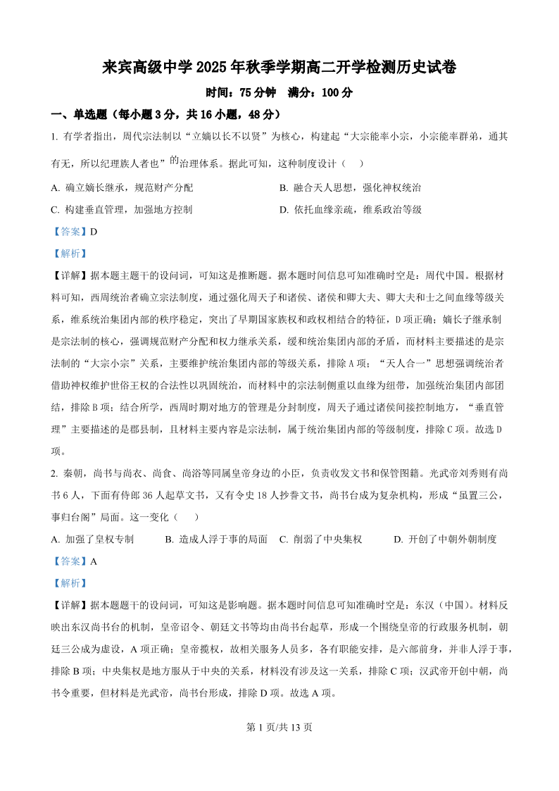高二历史(精品解析版)--广西壮族自治区来宾市兴宾区来宾高级中学2025-2026学年高二上学期开学考