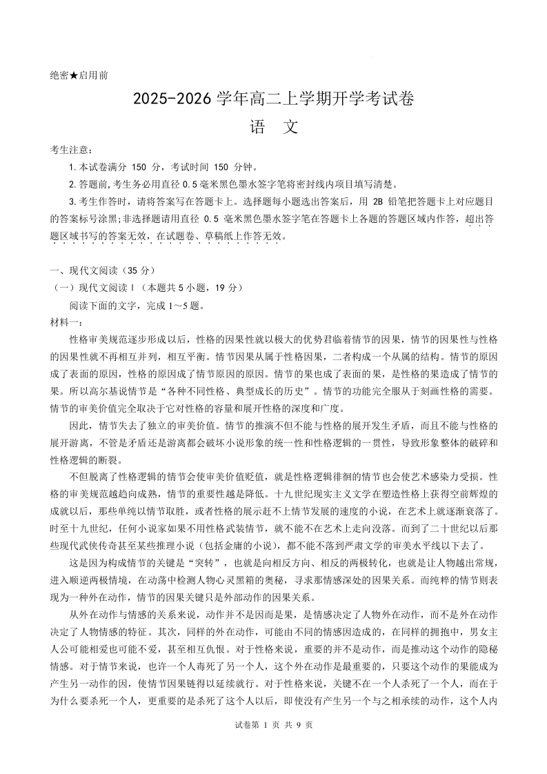 高二语文+答案--河北省保定市部分高中2025-2026学年高二上学期开学考试