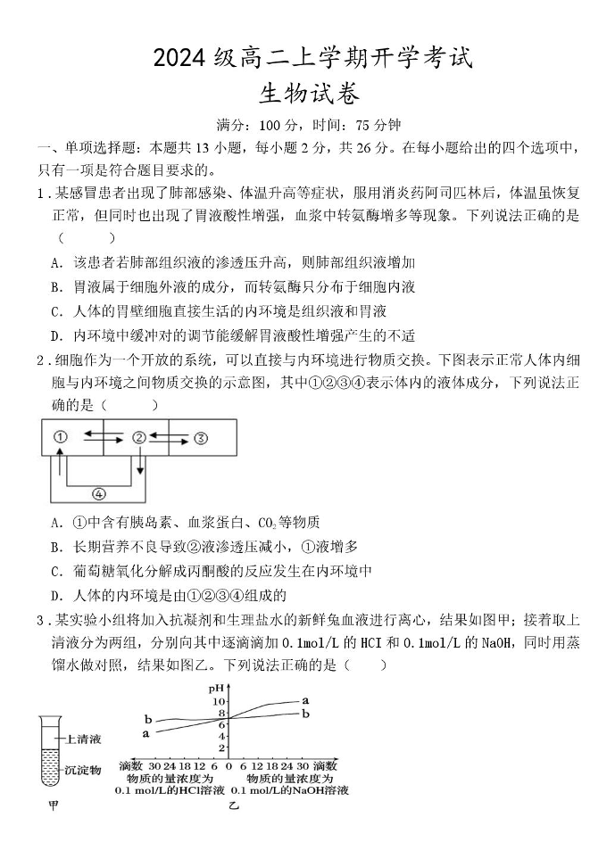 高二生物--河北省保定市部分高中2025-2026学年高二上学期开学考试