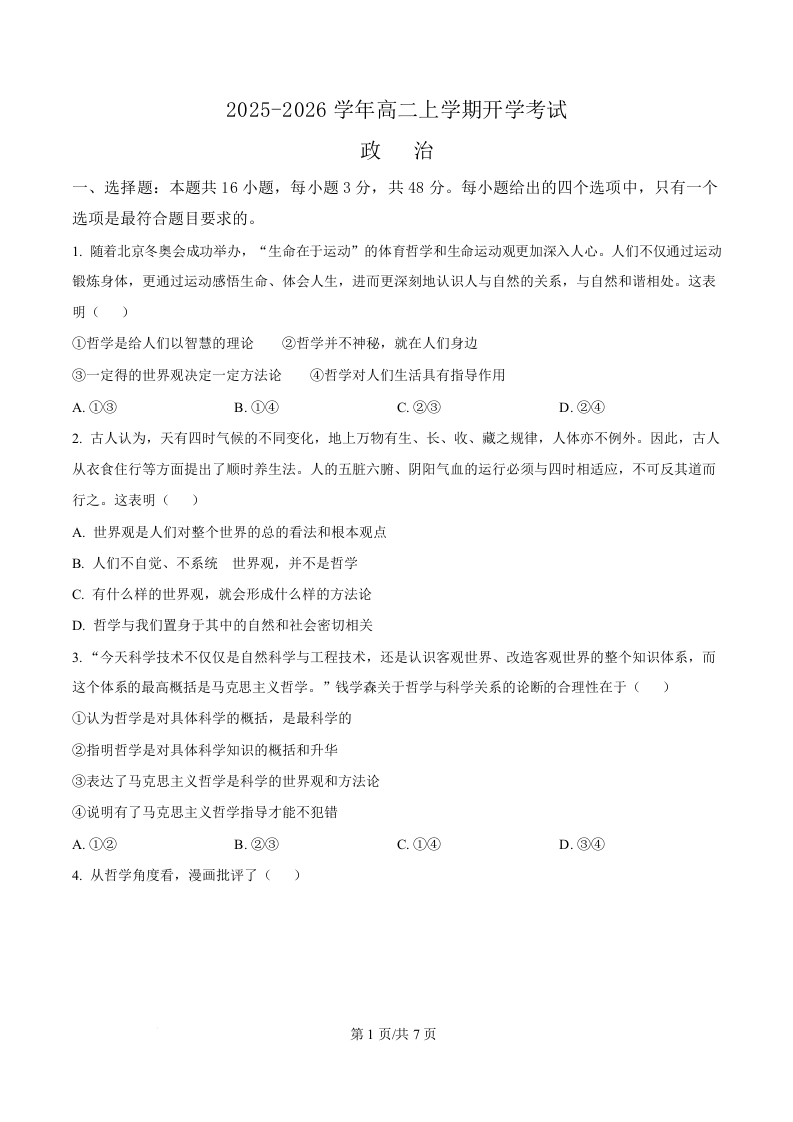 高二政治(原卷版)--河北省保定市部分高中2025-2026学年高二上学期开学考试