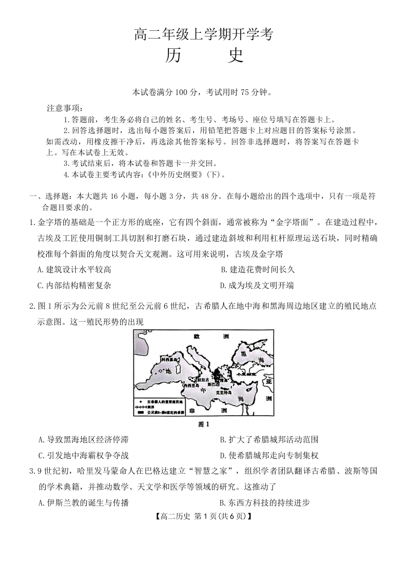 高二历史+答案--河北省保定市部分高中2025-2026学年高二上学期开学考试