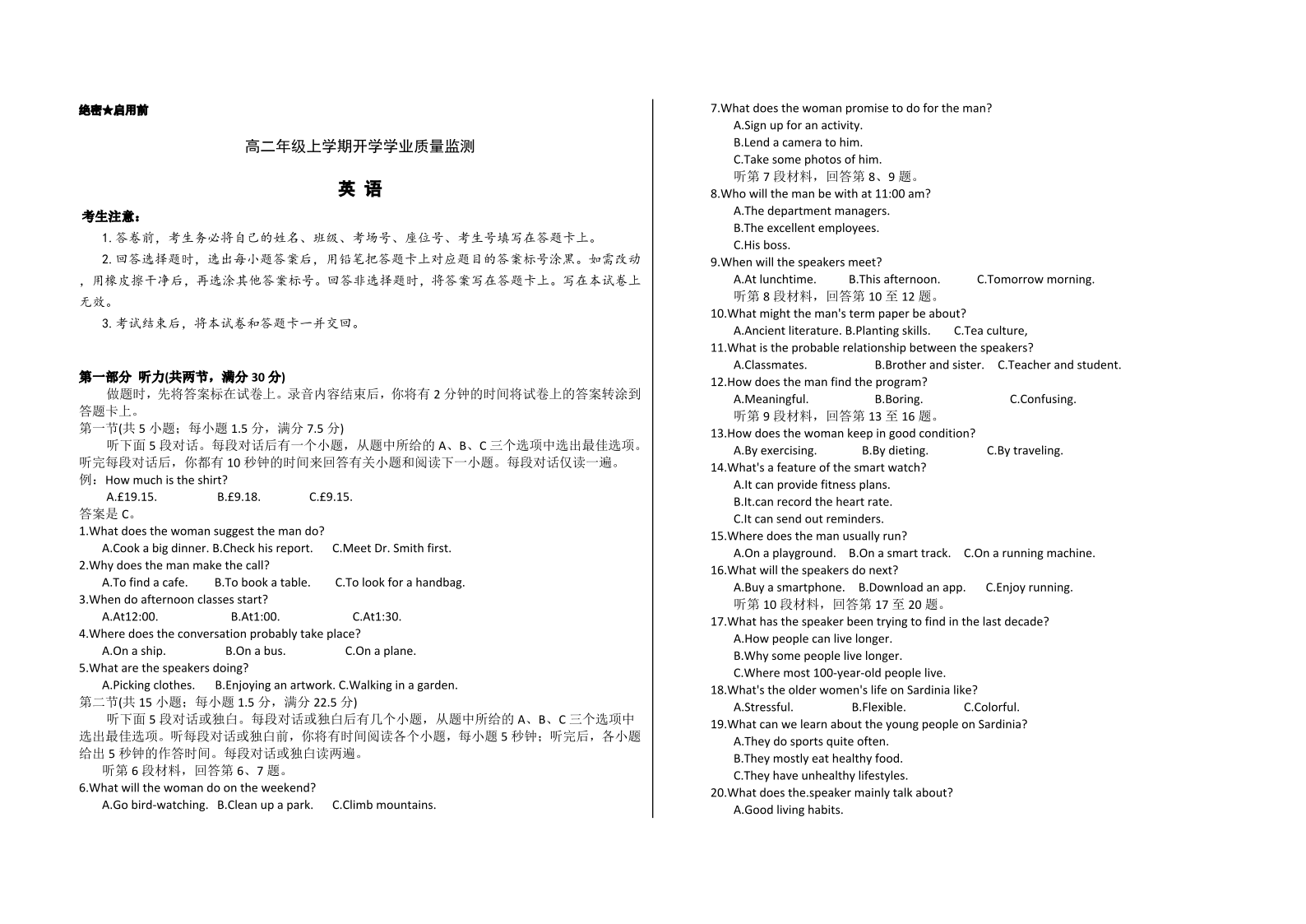 高二英语--河南省部分学校2025-2026学年高二上学期开学考试