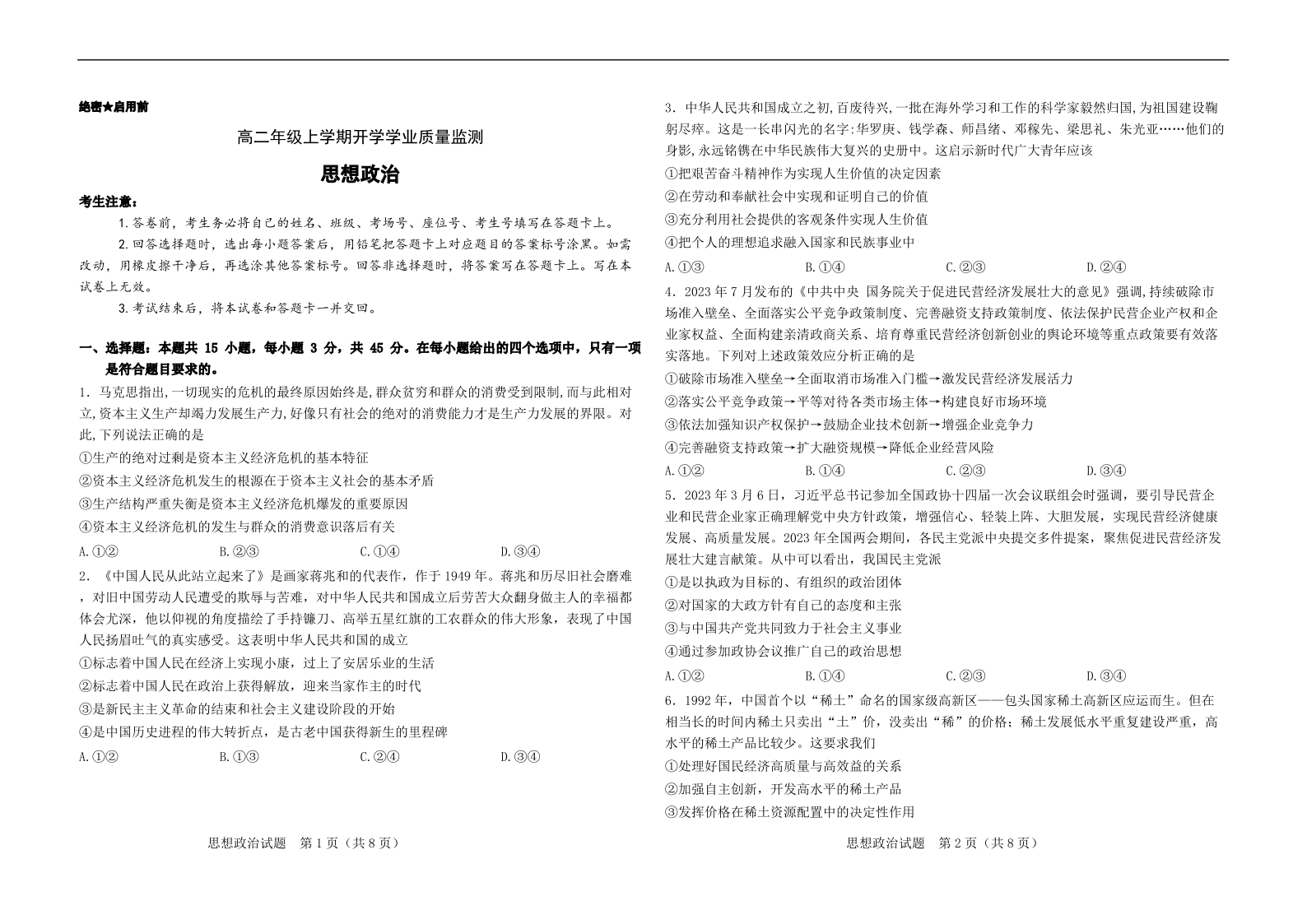 高二政治--河南省部分学校2025-2026学年高二上学期开学考试