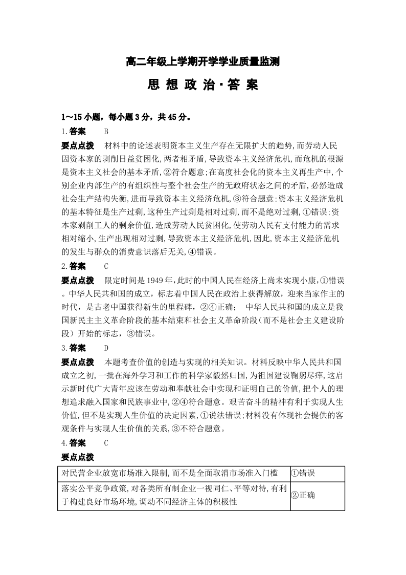 高二政治答案--河南省部分学校2025-2026学年高二上学期开学考试