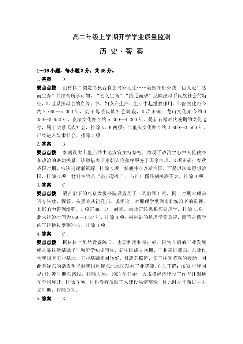 高二历史答案--河南省部分学校2025-2026学年高二上学期开学考试