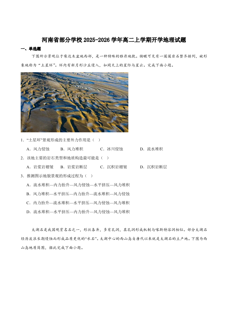 高二地理+答案--河南省部分学校2025-2026学年高二上学期开学考试