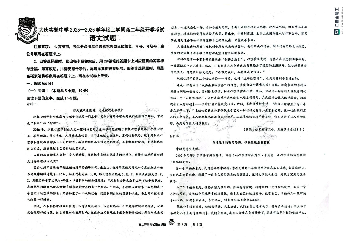 高二语文+答案--黑龙江省大庆实验中学2025-2026学年高二上学期开学考试