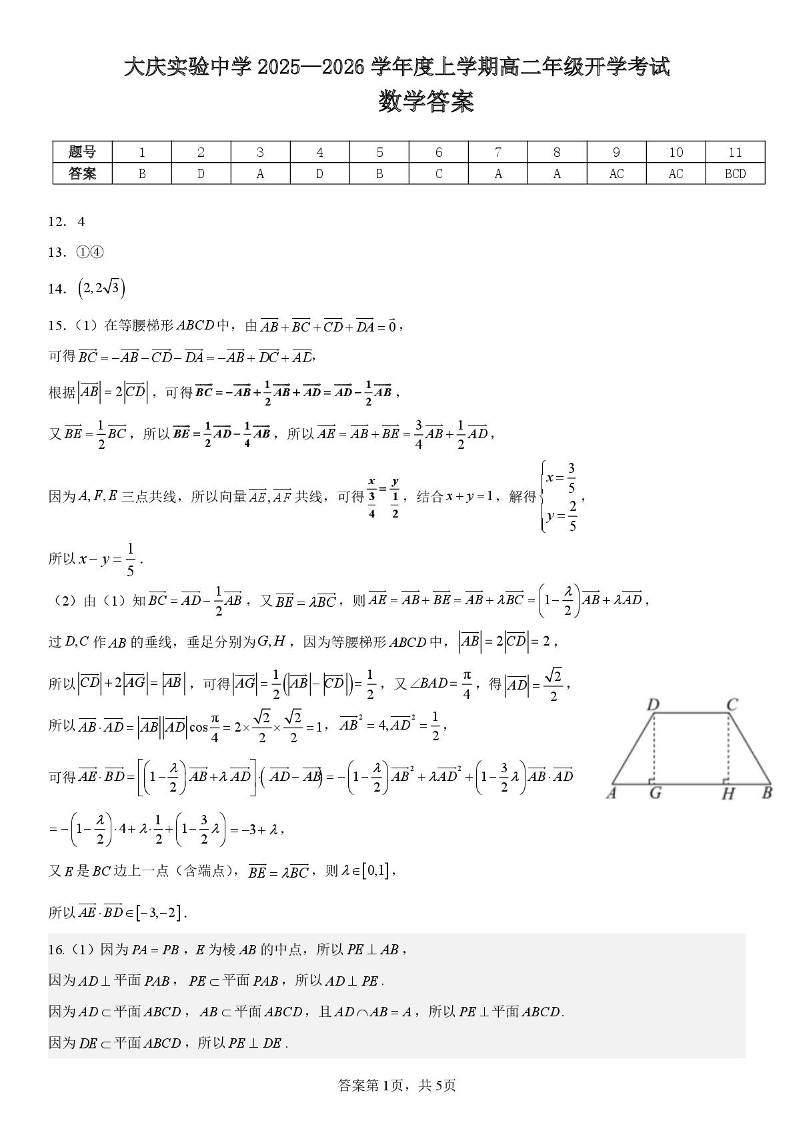 高二数学答案--黑龙江省大庆实验中学2025-2026学年高二上学期开学考试