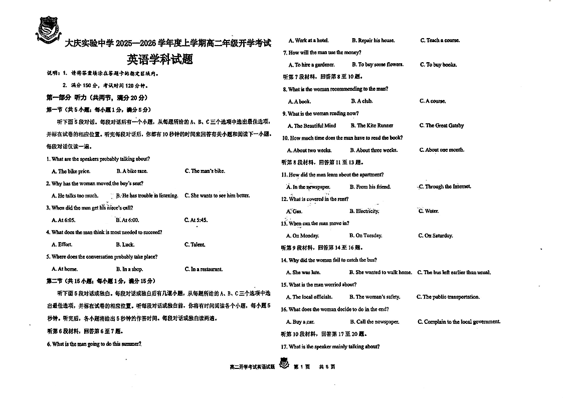 高二英语--黑龙江省大庆实验中学2025-2026学年高二上学期开学考试