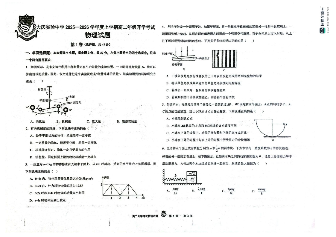 高二物理+答案--黑龙江省大庆实验中学2025-2026学年高二上学期开学考试