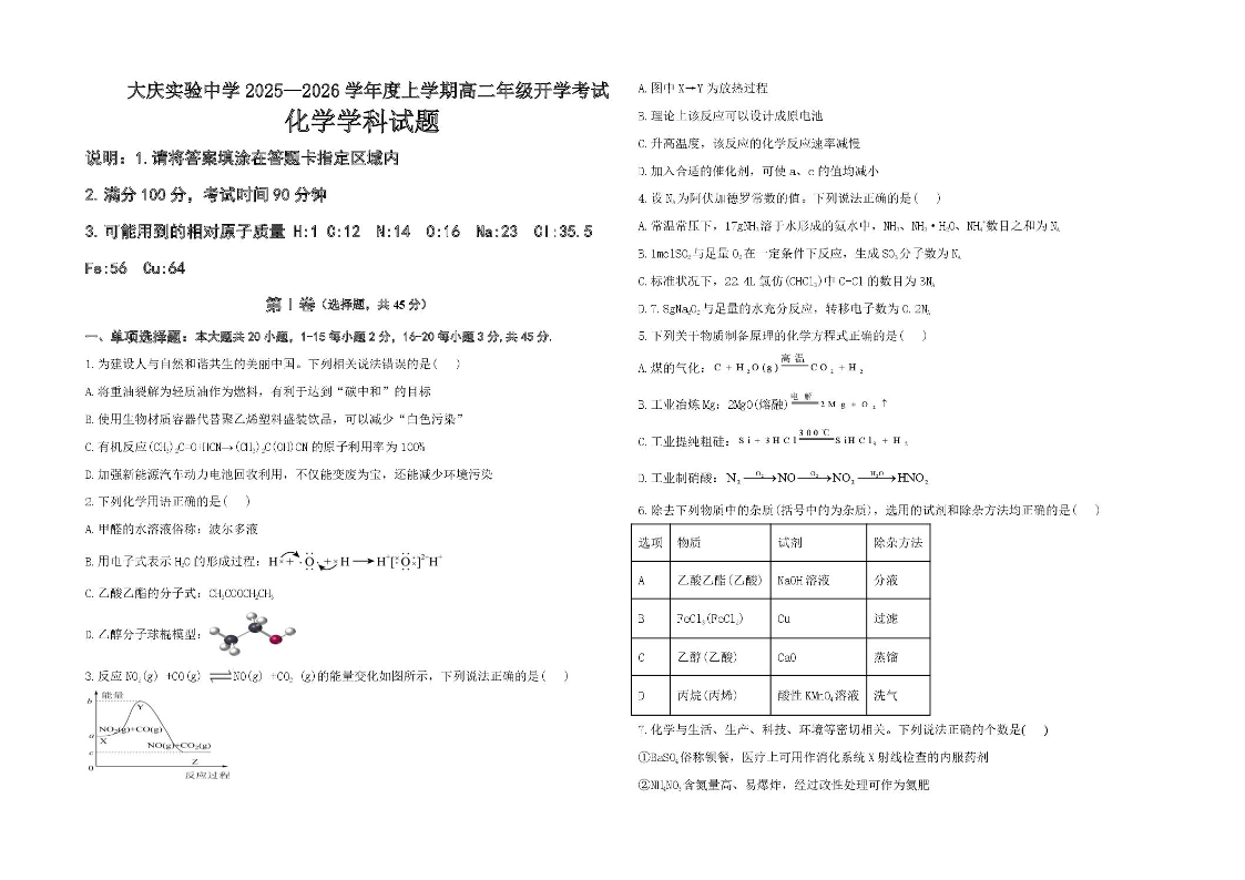 高二化学+答案--黑龙江省大庆实验中学2025-2026学年高二上学期开学考试