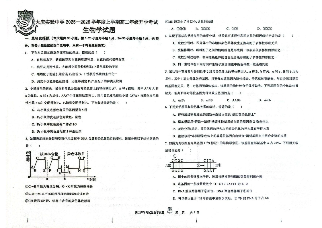 高二生物--黑龙江省大庆实验中学2025-2026学年高二上学期开学考试