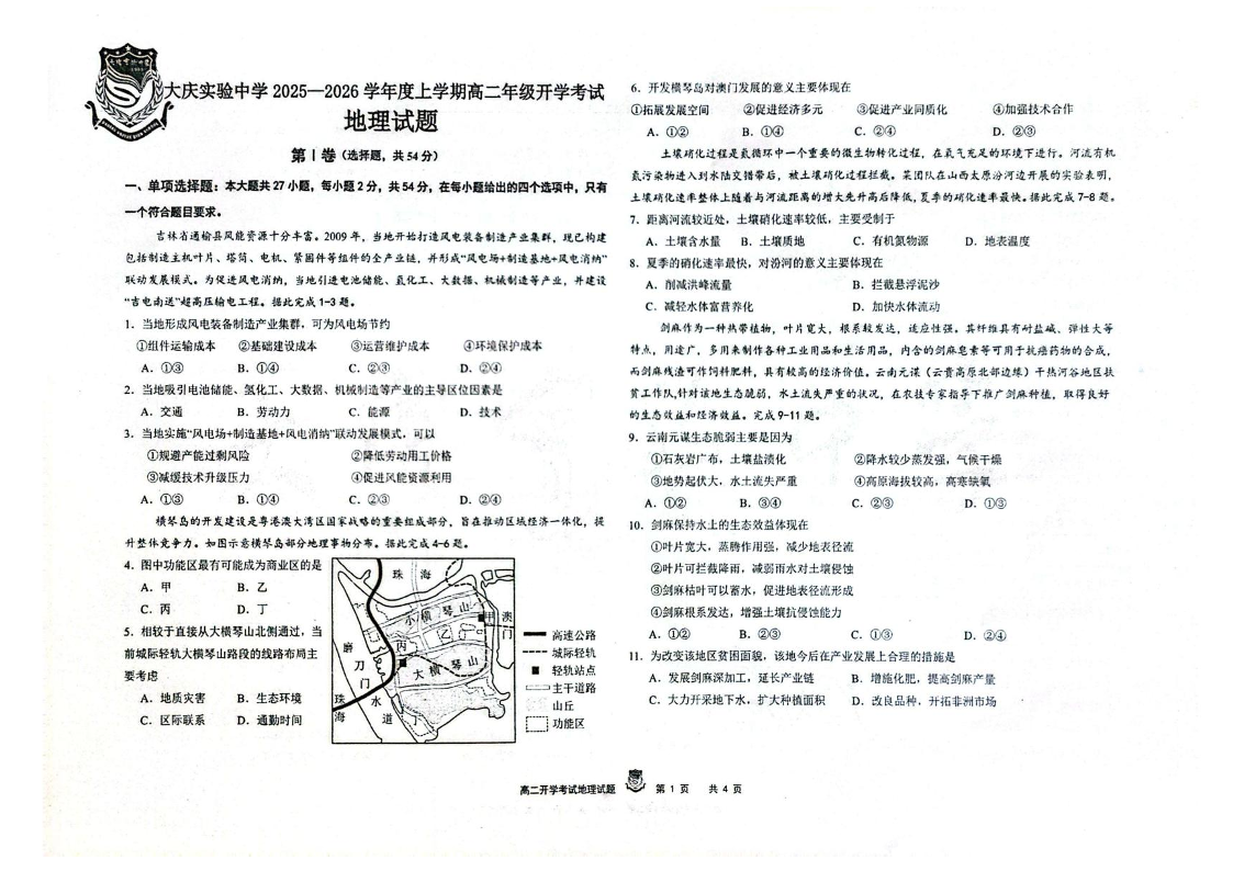高二地理+答案--黑龙江省大庆实验中学2025-2026学年高二上学期开学考试