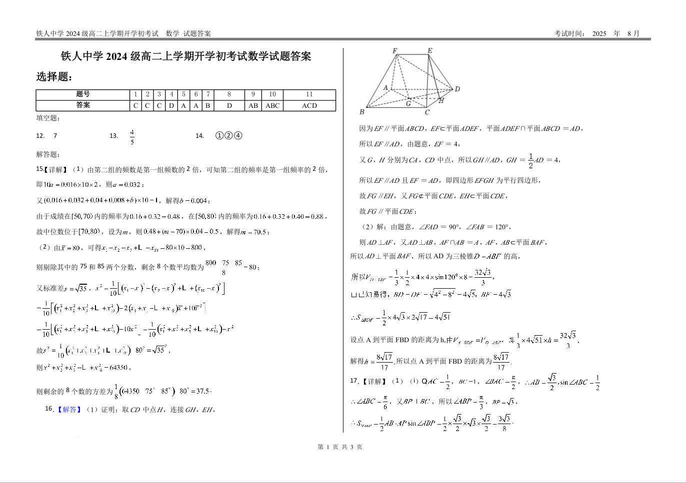 高二数学答案--黑龙江省大庆铁人中学2025-2026学年高二上学期开学考试