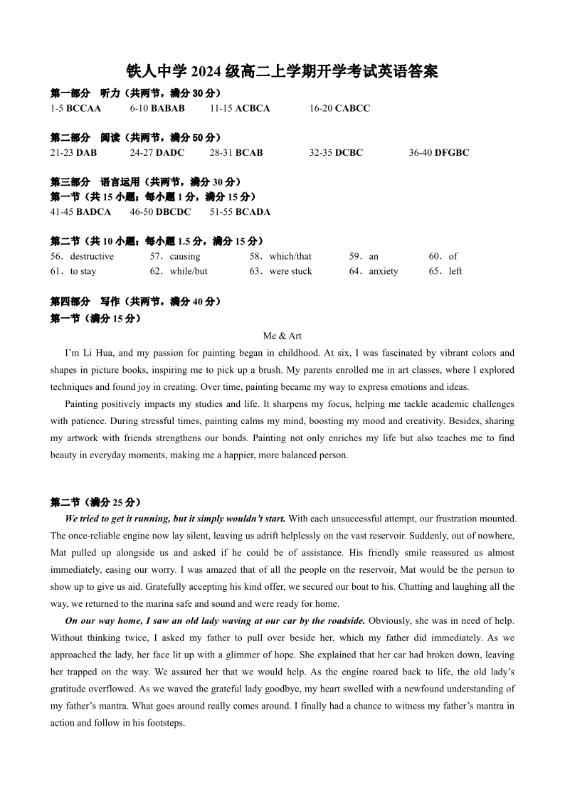 高二英语答案--黑龙江省大庆铁人中学2025-2026学年高二上学期开学考试