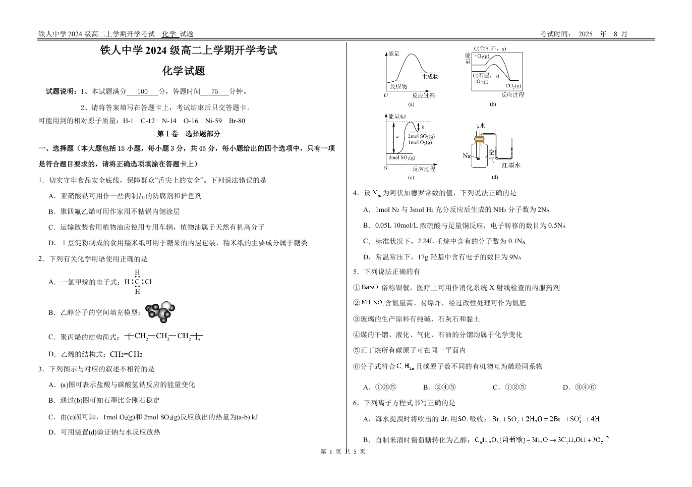 高二化学--黑龙江省大庆铁人中学2025-2026学年高二上学期开学考试