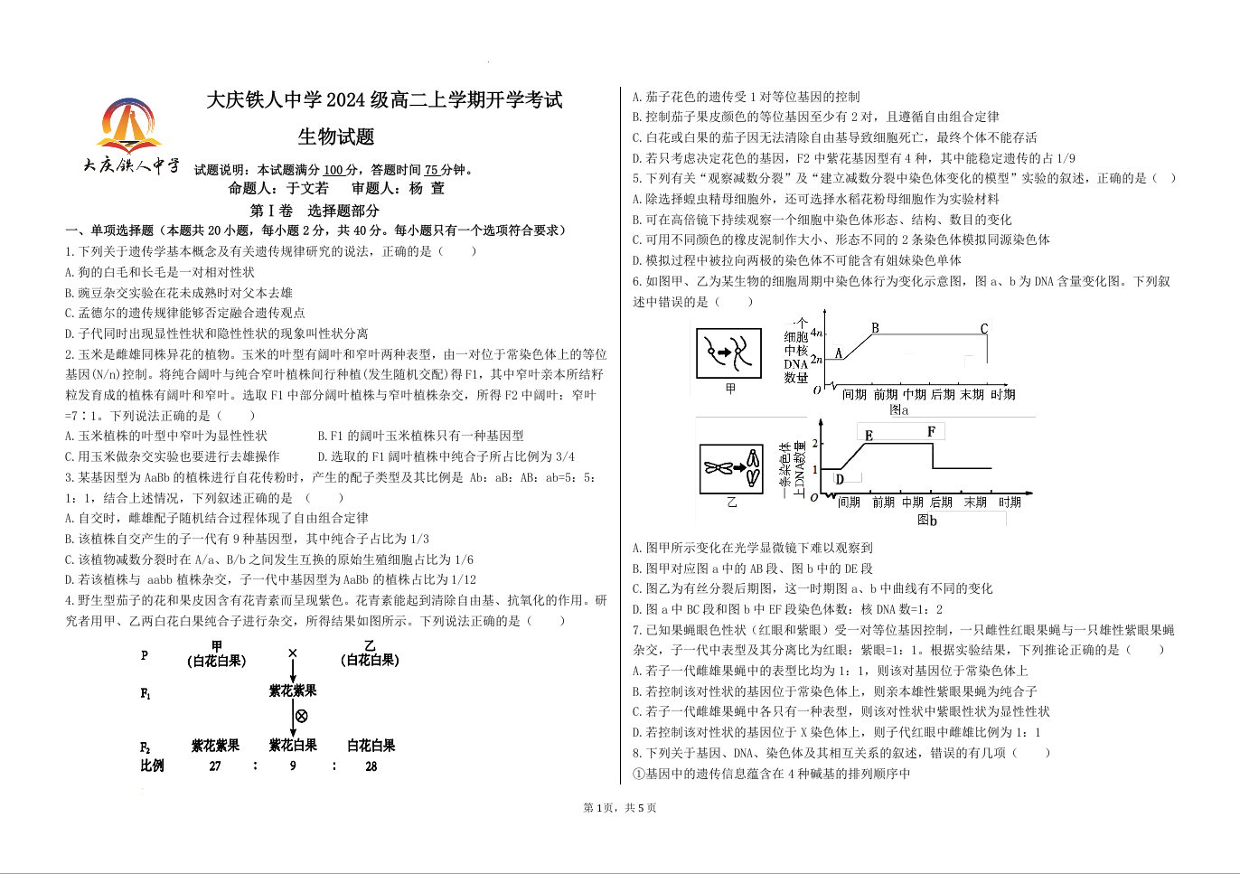 高二生物--黑龙江省大庆铁人中学2025-2026学年高二上学期开学考试