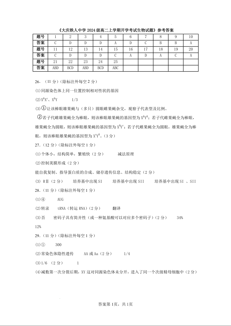 高二生物答案--黑龙江省大庆铁人中学2025-2026学年高二上学期开学考试
