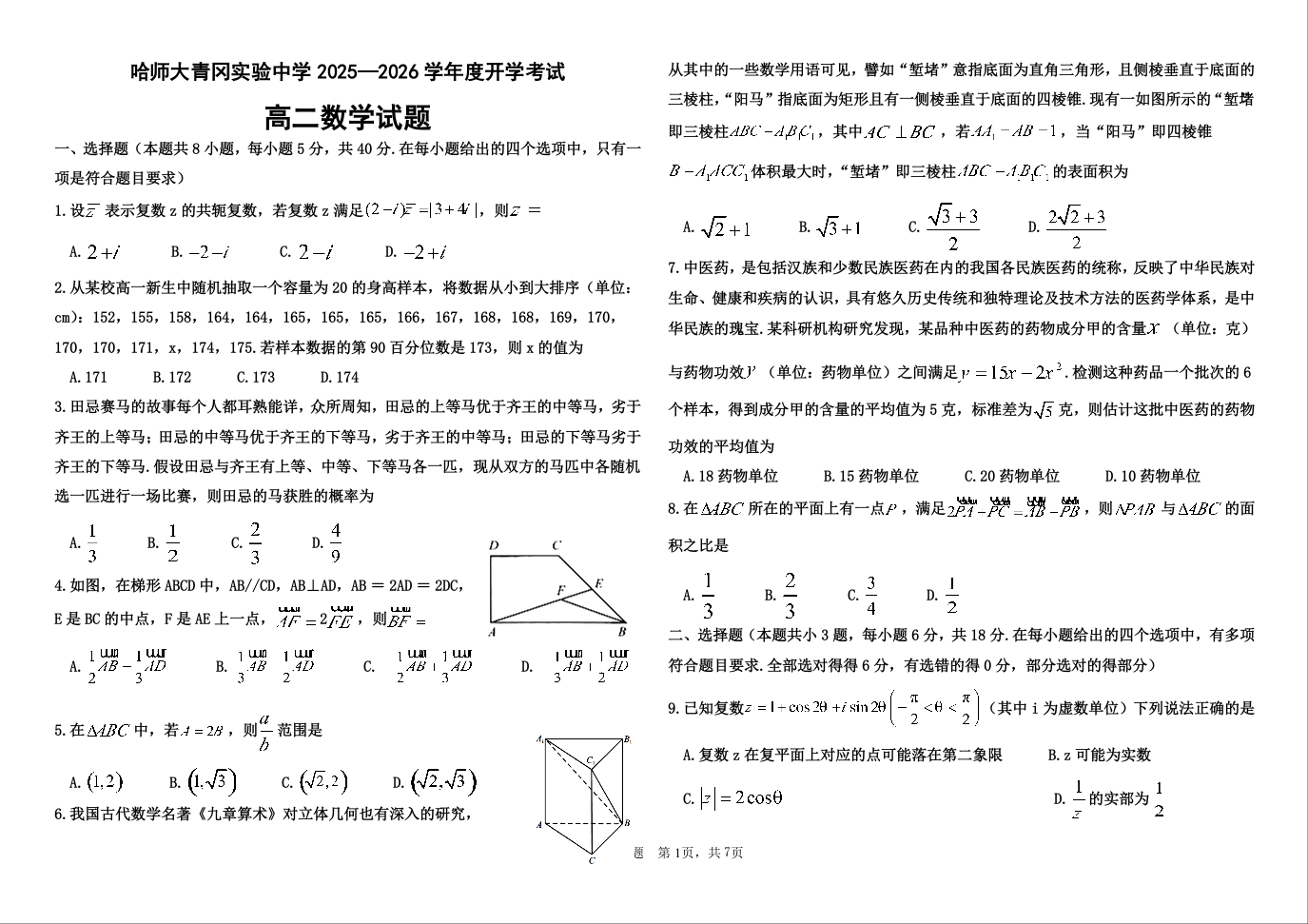 高二数学+答案--黑龙江省哈尔滨师范大学青冈实验中学校2025-2026学年高二上学期开学初考试
