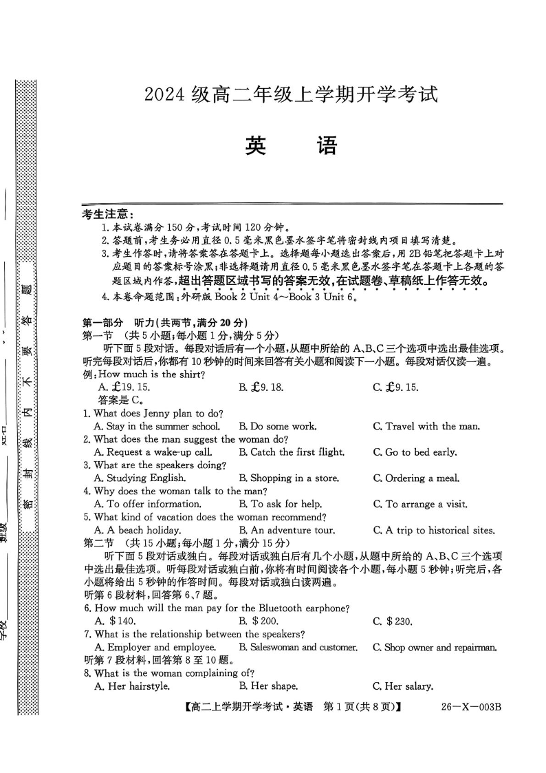 高三英语+答案--黑龙江省龙东联盟2025-2026学年高二上学期开学考试