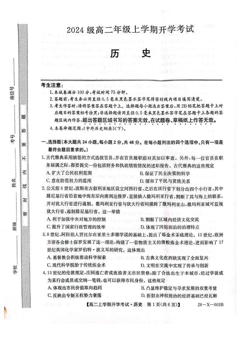 高三历史+答案--黑龙江省龙东联盟2025-2026学年高二上学期开学考试