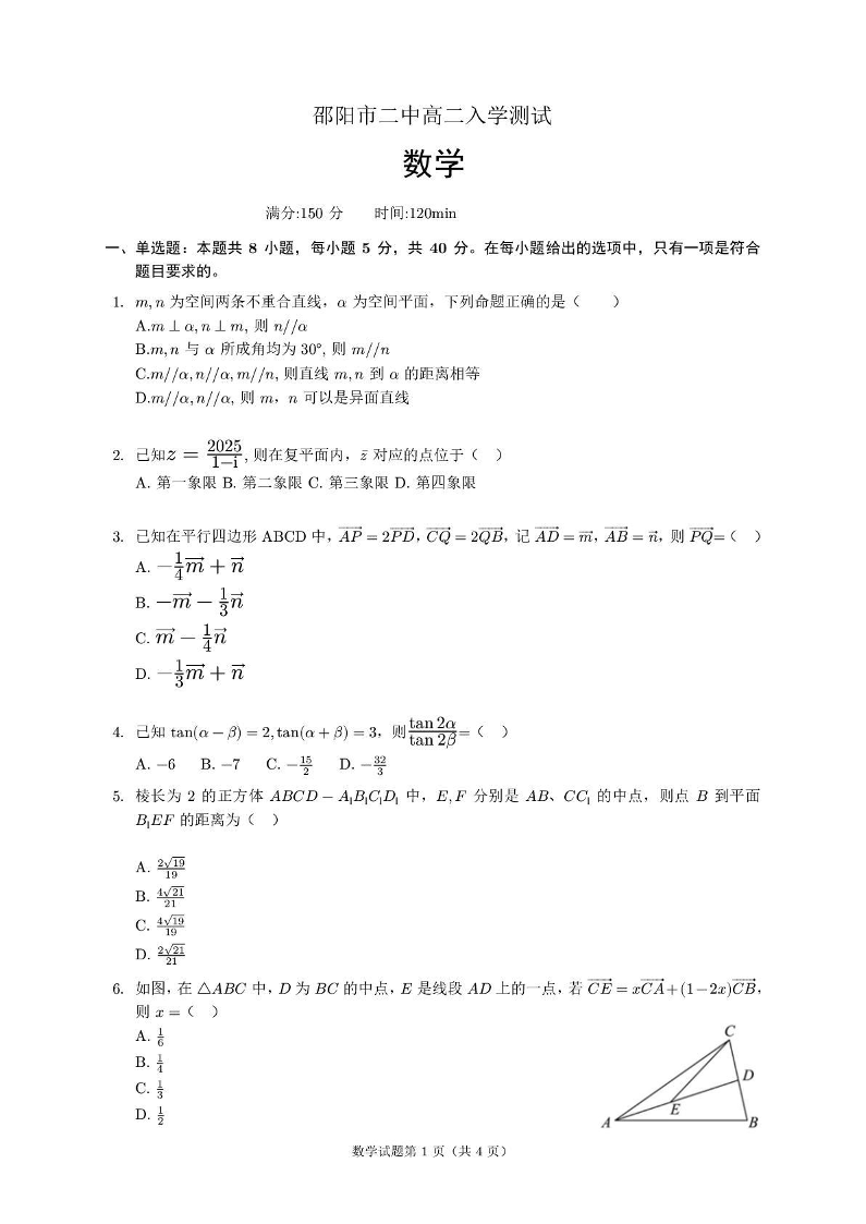 高三数学+答案--湖南省邵阳市第二中学2025-2026学年高二上学期入学考试