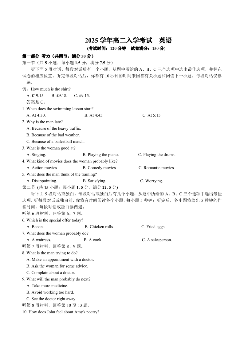 高三英语+答案--湖南省邵阳市第二中学2025-2026学年高二上学期入学考试