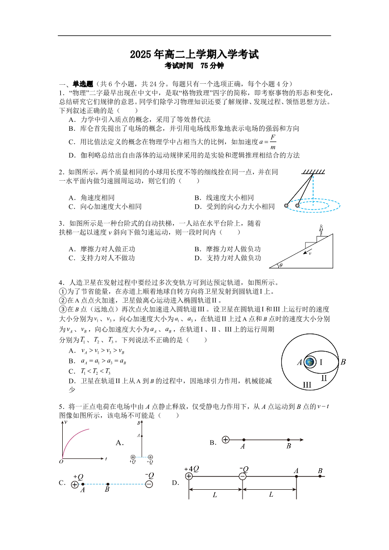 高三物理+答案--湖南省邵阳市第二中学2025-2026学年高二上学期入学考试